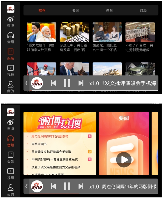 其次,在安全駕駛前提下的行車中,微博熱搜、新浪新聞等內容以更為清晰的信息流和方便的視聽形式呈現,讓用戶們在駕乘同時隨時隨地“聽”見新鮮事。在“聽”的體驗上,用戶還可以控制音頻播放速度、進度,跳轉查看音頻對應圖文,盡享智慧駕駛中的精神樂趣。