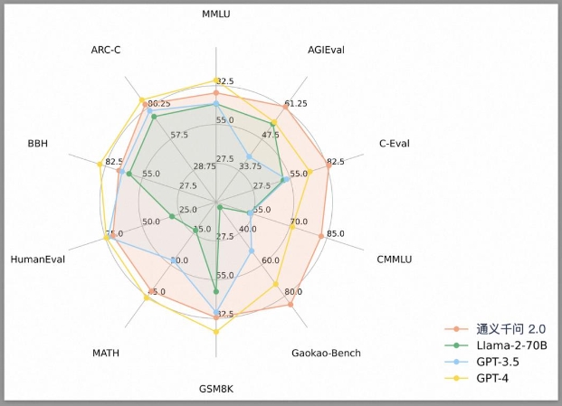 阿里云也亮出了通義千問和其他模型的比較結果。在 MMLU、C-Eval、GSM8K、HumanEval、MATH 等 10 個主流 Benchmark 測評集上,通義千問 2.0 的得分整體超越 Meta 的 Llama-2-70B。相比 OpenAI 的 Chat-3.5,是九勝一負;相比 GPT-4 則是四勝六負,與 GPT-4 的差距進一步縮小。
