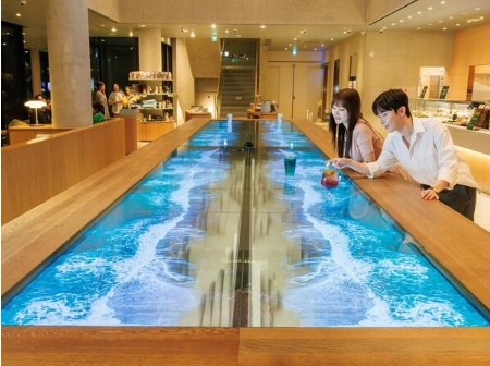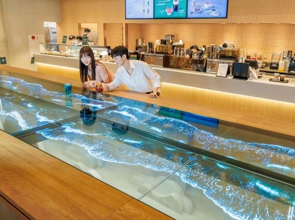 透明的 OLED 桌子被放置在商店一樓的中央,當飲料杯放在桌子上時,傳感器會做出反應并在玻璃杯周圍產生波浪效應。