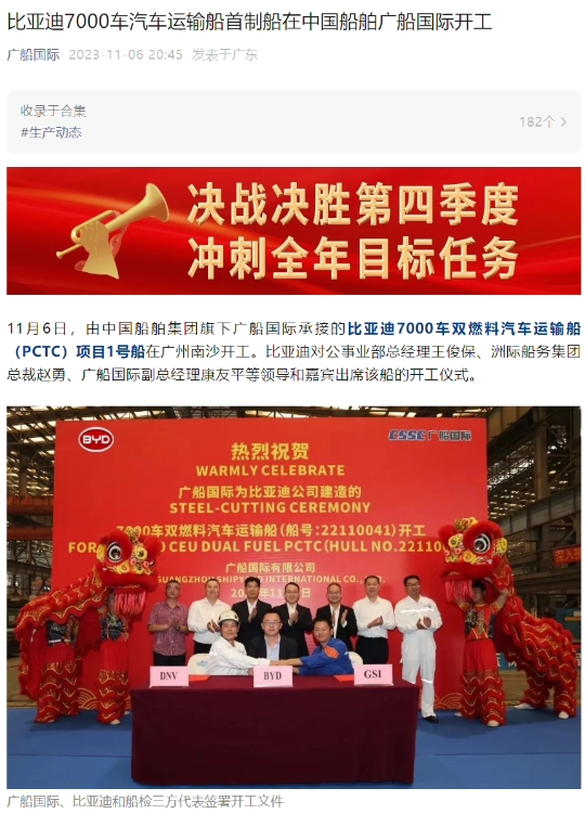 廣船國(guó)際公眾號(hào)發(fā)文,由中國(guó)船舶集團(tuán)旗下廣船國(guó)際承接的比亞迪 7000 車雙燃料汽車運(yùn)輸船(PCTC)項(xiàng)目 1 號(hào)船在廣州南沙開工。