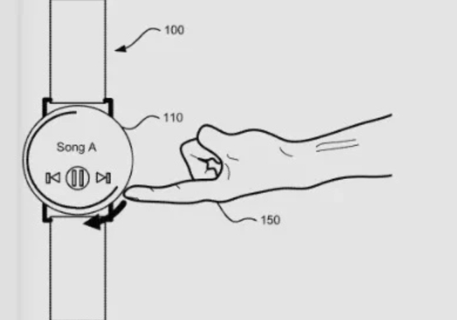據(jù)悉,專利申請?zhí)峁┝艘恍┤绾问褂脩冇媯鞲衅鱽砜刂浦悄苁直淼睦樱缬脩艨梢园聪率直淼膫?cè)面播放或暫停音樂,點擊手表頂部打開特定應用程序,擠壓手表的側(cè)面以縮放屏幕內(nèi)容,或輕掃手表的側(cè)面滾動瀏覽列表。