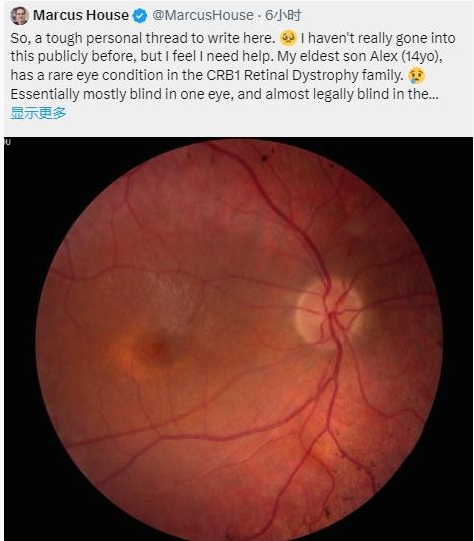 事情是這樣的,周二知名澳洲科技媒體人 Marcus House 在社交媒體上發(fā)文稱,他 14 歲的大兒子亞歷克斯患有 CRB1 視網(wǎng)膜營養(yǎng)不良癥這一罕見的眼病。