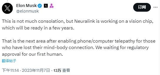 隨后,日常高強度網(wǎng)上沖浪的馬斯克回復(fù)了這條帖子。世界首富表示:“雖然這可能并不能給你太多安慰,但是 Neuralink 正在研發(fā)一種視覺芯片,預(yù)計幾年后就能完成。在幫助那些失去了身體與大腦連接的人實現(xiàn)手機/電腦心靈感應(yīng)之后,這是我們的下一個研究領(lǐng)域。我們正在等待監(jiān)管部門批準我們的第一位人類實驗對象。”