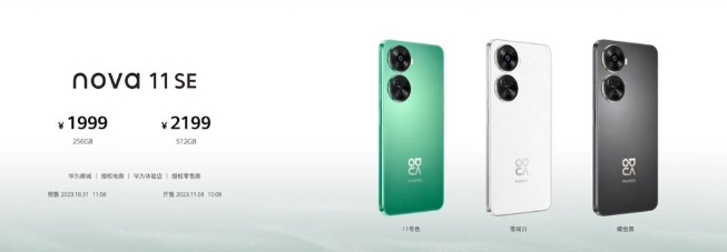 華為 nova 11 SE 今日正式發(fā)售,提供 256GB、512GB 兩種存儲(chǔ)版本以及 11 號(hào)色、雪域白、曜金黑三種配色,分別為 1999 元和 2199 元。
