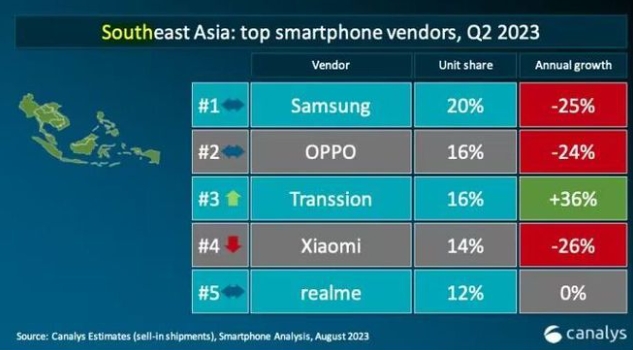 憑借部分可借鑒的市場經驗與極具競爭力的產品,中國手機廠商們在印尼智能手機市場如魚得水。據調研機構Canalys的最新統計,2023年二季度在印度尼西亞市場,OPPO以20%份額位列第一,三星緊隨其后,份額為19%,vivo、小米和傳音分別位列第三至第五,市場份額分別為18%、16%和13%。