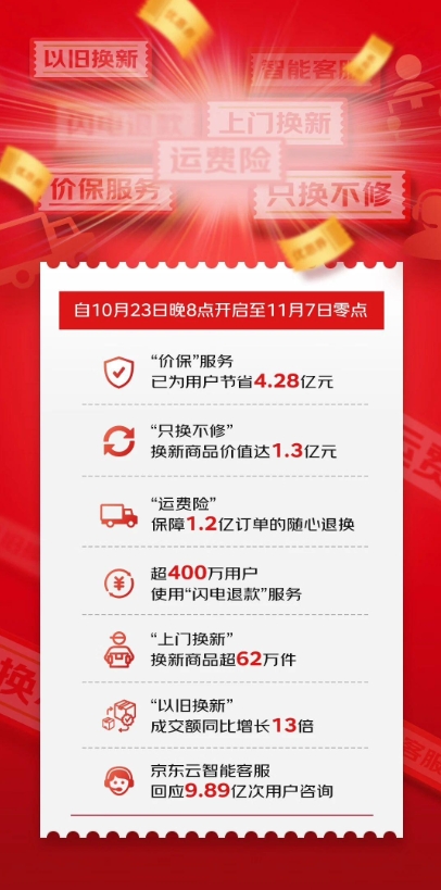 京東發文宣布,自 10 月 23 日晚 8 點至 11 月 7 日零點,“一鍵價保”已為用戶節省 4.28 億元,“只換不修”換新商品價值達 1.3 億元,“運費險”已保障 1.2 億訂單,超 400 萬用戶使用“閃電退款”服務,“上門換新”換新商品超 62 萬件,“以舊換新”成交額同比增長 13 倍,京東云智能客服回應 9.89 億次用戶咨詢。