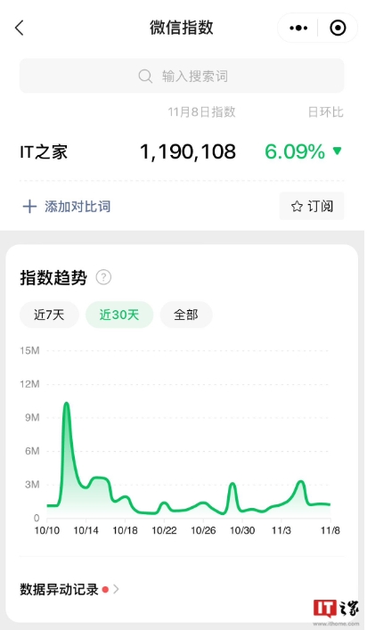 “微信指數”是微信官方提供的基于微信大數據分析的移動端指數,可以為行業從業者提供一些網絡趨勢參考,用戶可以直接訪問小程序,輸入各種詞匯,檢索最近 7 天、30 天或 90 天內的熱度變化趨勢。