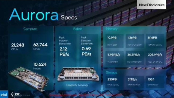 值得一提的是,Aurora 是基于 HPE Cray EX(英特爾百億億級計算芯片)所建造的,其中使用了英特爾 Xeon CPU Max 系列處理器和英特爾數據中心 GPU Max 系列加速器,并通過 HPE 的 Slingshot-11 網絡進行通信。