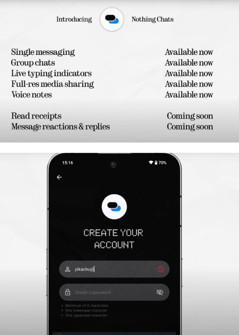 Nothing 首席執行官 Carl Pei 聲稱,該應用程序將支持單聊、群聊、影音文件共享、語音、即時顯示用戶輸入情況等功能,未來還將添加“消息反應”和“回復”等功能。