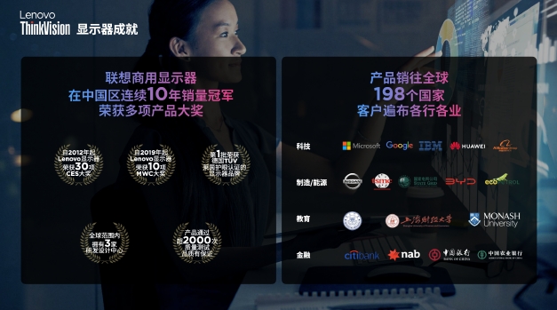 基于過往的產品和技術的深厚積淀,截至目前聯想ThinkVision顯示器在全球范圍內擁有3家研發設計中心,產品已在全球198個國家和地區銷售,用戶遍布科技、制造、教育、金融等各行各業。IDC的數據顯示,聯想ThinkVision顯示器已連續10年在中國商用市場保持第一位,在聯想2023/24財年第二季度排名全球前三。