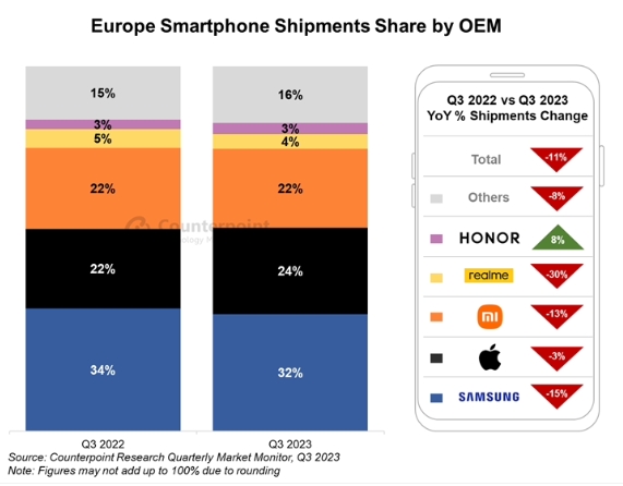 根據市場調查機構 Counterpoint Research 公布的最新報告,2023 年第 3 季度歐洲智能手機出貨量下降 11%,其中西歐下降了 8%,東歐下降了 15%。