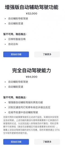 FSD為完全自動(dòng)駕駛能力,在EAP的基礎(chǔ)上增加了識(shí)別交通信號(hào)燈和停車標(biāo)志并做出反應(yīng)的能力,以及在城市街道中自動(dòng)輔助駕駛等功能,目前在國(guó)內(nèi)售價(jià)為6.4萬(wàn)元。