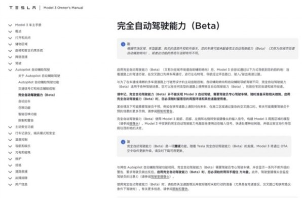 而就在這兩天,在特斯拉中國(guó)官網(wǎng)的車主手冊(cè)里,也出現(xiàn)了完全自動(dòng)駕駛能力(Beta)的功能的功能介紹。