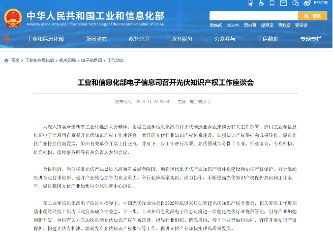 在工業(yè)和信息化部電子信息司指導下,中國光伏行業(yè)協(xié)會自 2022 年底以來啟動籌建光伏知識產權專委會,相關籌備工作近期基本就緒并擬于年內正式宣布成立專委會。下一步,工業(yè)和信息化部電子信息司將進一步強化光伏行業(yè)規(guī)范管理,引導產業(yè)加強創(chuàng)新升級,會同有關方面加快推動光伏知識產權體系建設,指導行業(yè)組織、研究機構、骨干企業(yè)等加強協(xié)同,有序開展知識產權保護、構建光伏專利池、編制發(fā)布光伏知識產權報告等工作,促進光伏產業(yè)加快實現高質量發(fā)展。