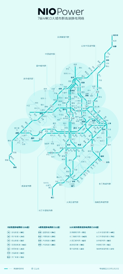 截至 11 月 23 日,蔚來已在全國累計建成 2127 座換電站,其中 660 座高速換電站,完成 7 縱 4 橫 10 大城市群高速換電網(wǎng)絡布局:G1 京哈、G2 京滬、G3 京臺、G4 京港澳、G5 京昆、G15 沈海、G30 連霍蘇陜段、G42 滬蓉、G45 大廣京廣段、G50 滬渝、G60 滬昆滬湘段和京津冀、長三角大灣區(qū)、成渝、長江中游、山東半島、關(guān)中、中原、晉中、海峽西岸。