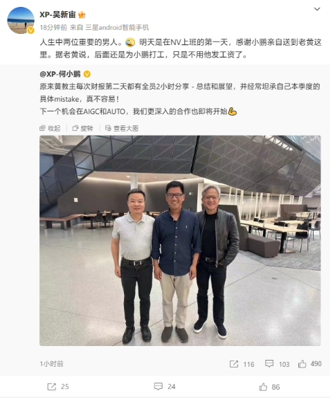圖片顯示,何小鵬親自送吳新宙前去英偉達總部“報到”,何小鵬還發文稱“原來黃教主每次財報第二天都有全員 2 小時分享 - 總結和展望,并經常坦承自己本季度的具體 mistake,真不容易!下一個機會在 AIGC 和 AUTO,我們更深入的合作也即將開始。”