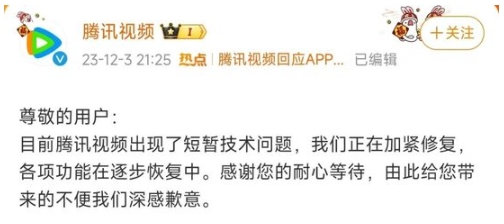 騰訊視頻官方微博3日晚發(fā)文稱,目前騰訊視頻出現(xiàn)了短暫技術(shù)問題,正在加緊修復(fù),各項功能在逐步恢復(fù)中。