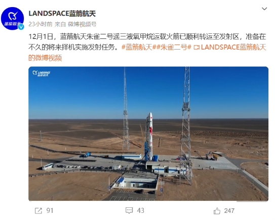 據藍箭航天 12 月 3 日消息,12 月 1 日,藍箭航天朱雀二號遙三液氧甲烷運載火箭已順利轉運至發射區,準備在不久的將來擇機實施發射任務。