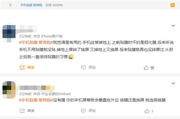 有網(wǎng)友表示:“貼了損失幾十塊,不貼換屏大幾千”“沒有膜,你的手機屏幕就會暴露在外邊,換膜還是換屏,我選擇換膜”“10塊以內(nèi)高清膜挺好,摔了也不心疼,防窺膜和藍光膜就很智商稅了”等等。
