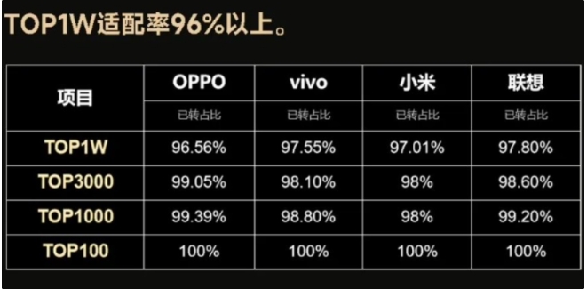 根據金標聯盟此前公布的數據,截至 12 月 1 日,OPPO、vivo、小米、聯想應用商店 TOP100 應用 100% 適配 64 位,TOP1000 應用 98% 以上適配 64 位,TOP3000 應用 98% 以上適配 64 位,TOP1W 應用 96% 以上適配 64 位。