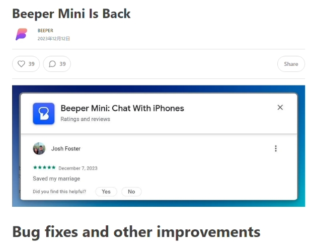 Beeper 今天再次發布博文《Beeper Mini Is Back》,表示這款應用重新上架。