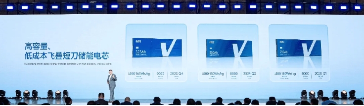 在儲能賽道,蜂巢能源基于“飛疊 + 短刀”更安全的解決方案,發布全新的飛疊短刀儲能電池迭代產品,包含尺寸不變、體系升級的 350Ah 飛疊短刀儲能專用電芯和尺寸加厚的 710Ah 飛疊短刀儲能電芯,以及三款容量為 310Ah、330Ah、660Ah 的長壽命體系儲能電芯,以及全球首款 6Mwh-20 尺集裝箱。
