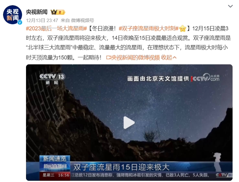 據央視新聞報道,明日(12 月 15 日)凌晨 3 時左右,雙子座流星雨將迎來極大,今晚至明日凌晨最適合觀賞。