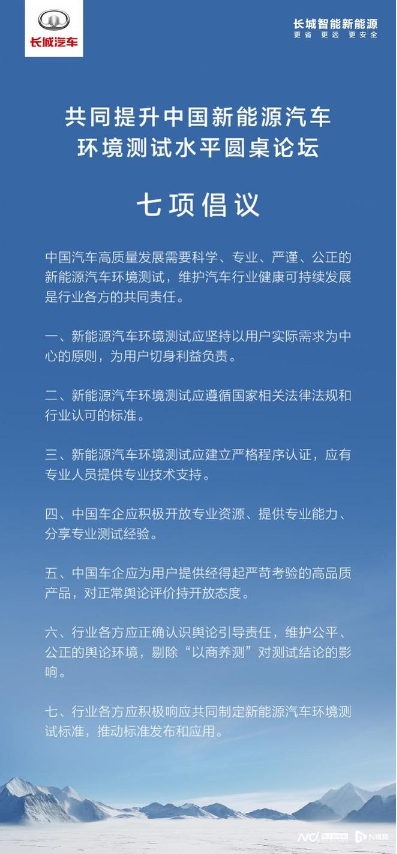 12 月 14 日,長城汽車舉行倡議關于“共同提升中國新能源汽車環境測試水平”的圓桌論壇。活動現場,長城汽車提出了七項倡議,包括新能源汽車環境測試應建立嚴格程序認證,應有專業人員提供專業技術支持等,并宣布向全行業開放所有“新能源汽車測試平臺”,倡議其他車企開放測試資源,共同支持中國汽車高質量發展和高質量測試,推動更加專業、嚴謹的“新能源汽車環境測試標準”,呼吁早日出臺。