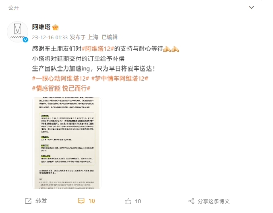 阿維塔今天凌晨在官微宣布將對延期交付的訂單給予補償,并稱生產團隊正在全力加速。該車已在 12 月 10 日開啟全國交付,陸續登陸 19 省 40 城。