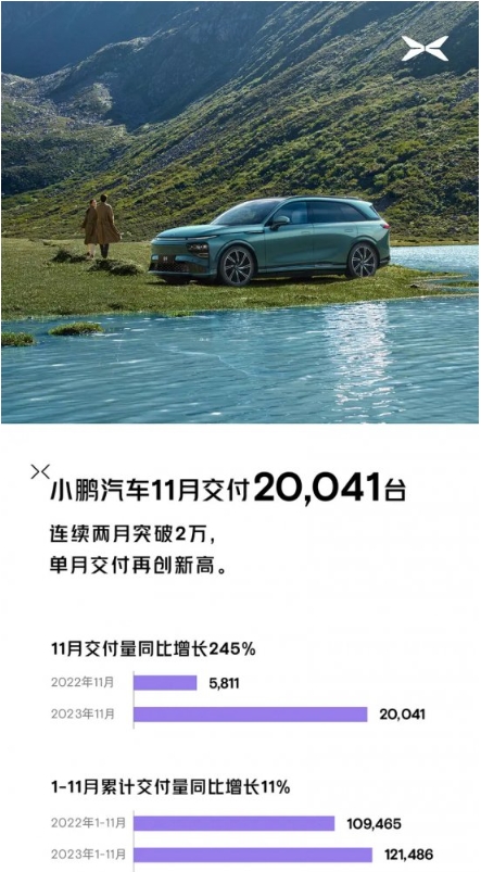 12月1日,小鵬汽車公布了最新交付數(shù)據(jù)。11月小鵬汽車共交付新車20041臺(tái),同比增長245%。小鵬G6交付8750臺(tái),繼續(xù)領(lǐng)跑20萬以上中國品牌純電動(dòng)SUV月銷量榜。今年以來,小鵬汽車已連續(xù)10個(gè)月保持月交付正增長,截至11月末小鵬汽車2023年累計(jì)交付量達(dá)121486臺(tái),超2022年全年累計(jì)交付量。