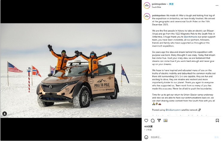 “Pole to Pole”(跨越極地)探險團隊北京時間今天早上發文宣布,今年 12 月 15 日,一對英國探險家夫婦于當地時間 12 月 15 日成功駕駛電動汽車抵達南極洲,這是史上首輛跨越兩極的電動汽車乃至所有汽車。