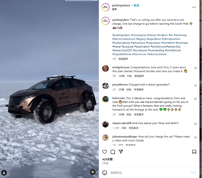 這對名為 Chris 和 Julie 的夫婦于今年 3 月從北極出發,駕駛的車輛是日產旗下純電動 SUV 艾睿雅,不過這輛汽車經過了冰島一家改裝車公司的改造,目的是將其作為未來電動汽車改裝的概念驗證,最終希望能夠取代目前用于南極研究、科考所用的柴油汽車。