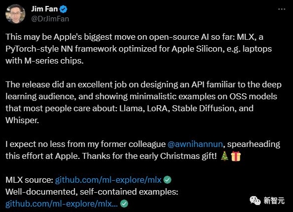 MLX 的另一大特點(diǎn),像 Jim Fan 指出的那樣,是它設(shè)計(jì)出色的 API。