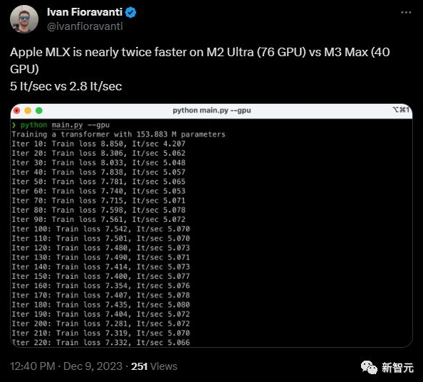 一位網(wǎng)友對(duì) MLX 的速度進(jìn)行了測(cè)試,他在推文中表示,使用 Apple MLX 框架進(jìn)行計(jì)算的速度,M2 Ultra(76 個(gè) GPU)可達(dá)到每秒 5 次迭代(It/sec),而 M3 Max(40 個(gè) GPU)可以達(dá)到每秒 2.8 次迭代。