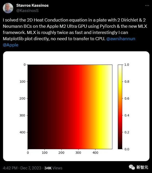 其他開發(fā)人員也對(duì)于 MLX 進(jìn)行了其他有趣的嘗試,比如一位來自塞浦路斯大學(xué)的教授,在使用 PyTorch 和新的 MLX 框架的情況下,成功在 Apple M2 Ultra GPU 上解決了一個(gè)板上的二維熱傳導(dǎo)方程問題,其中包含兩個(gè) Dirichlet 和兩個(gè) Neumann 邊界條件。