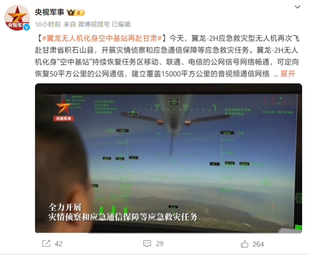 翼龍-2H 無人機再赴甘肅地震災(zāi)區(qū)執(zhí)行任務(wù):可定向恢復(fù) 50 平方公里公網(wǎng)通信 09:32:29