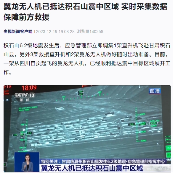 據(jù)央視軍事報道,翼龍-2H 應(yīng)急救災(zāi)型無人機 20 日從四川自貢蘭田機場起飛,再次飛赴甘肅省積石山縣,開展災(zāi)情偵察、應(yīng)急通信保障等應(yīng)急救災(zāi)任務(wù)。