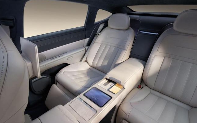 蔚來 ET9 車長超 5.3 米,寬 2 米,軸距 3.2 米以上。在超大空間體量下,蔚來 ET9 選擇四座布局,首創(chuàng)前后排貫穿的“行政橋”,可以實現(xiàn)分區(qū)的同時,集成多項功能。例如,可以 360°無級調(diào)節(jié)的行政桌案,能夠滿足后排乘客閱讀辦公、會議對談和演示分享的需求。
