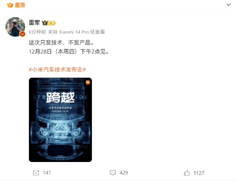 小米汽車技術發布會官宣定檔 12 月 28 日:雷軍稱“這次不發產品” 09:33:06