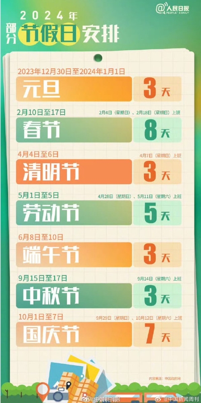 2024年的部分節假日安排也大體出爐,2月10-17日是春節假期,但需要調休,2月4日、18日周日上班。