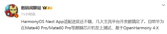 據博主 @數碼閑聊站 今日爆料,華為 HarmonyOS Next App 適配進度良好,幾大主流平臺開發都搞定了。目前華為在 Mate40 Pro / Mate60 Pro 等麒麟芯片機型上測試,基于 OpenHarmony 4.X 打造。