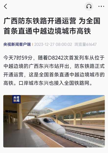 據(jù)央視新聞消息,今天 7 時(shí) 59 分,隨著 D8242 次首發(fā)列車從位于中越邊境的廣西東興市站開出,防東鐵路正式開通運(yùn)營,這是全國首條直通中越邊境城市的高鐵。口岸城市東興也接入全國鐵路網(wǎng)。
