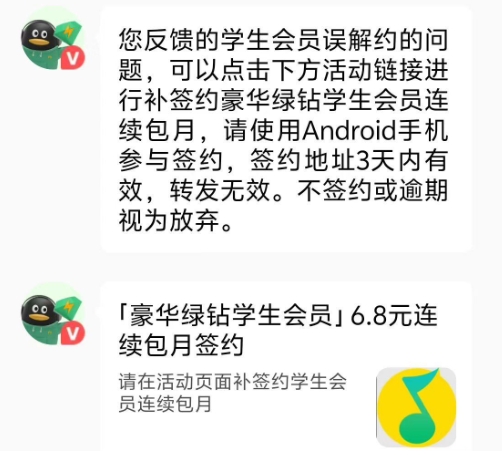 您反饋的學生會員誤解約的問題,可以點擊下方活動鏈接進行補簽約豪華綠鉆學生會員連續包月,請使用 Android 手機參與簽約,簽約地址 3 天內有效,轉發無效。不簽約或逾期視為放棄。