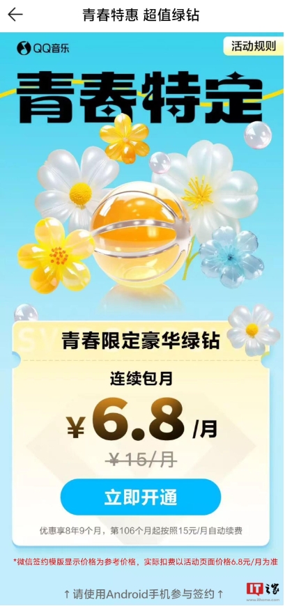 補簽約頁面顯示,青春限定豪華綠鉆連續包月價格仍為 6.8 元 / 月,優惠享 8 年 9 個月,第 106 個月起按照 15 元 / 月自動續費。