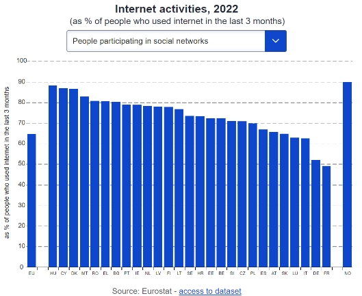 2022年,90%的歐盟人口報告說他們在過去3個月內使用過互聯網。仔細研究一下他們在網上的行為就會發現,互聯網主要用于與他人交流,例如收發電子郵件(86%)和即時通訊(80%)。