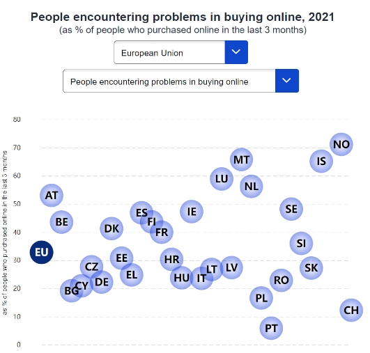 在歐盟,網購買家遇到的最常見的問題是交貨速度比預期慢,21%的買家報告了這個問題。9%的網購買家表示,網站太難使用;8%的人表示遇到的主要問題是錯誤或損壞的商品或服務。