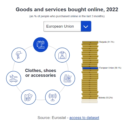 2022年,在網購的人群中有68%購買了衣服、鞋子或配飾。