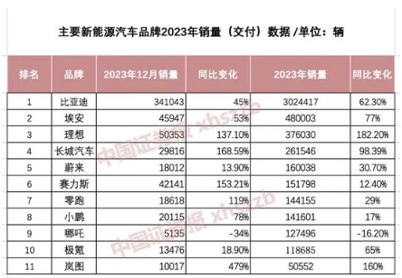 銷量前十的新能源品牌是:比亞迪、埃安、理想、長城汽車、蔚來、賽力斯、零跑、小鵬、哪吒、極氪。其中,傳統車企創二代表現亮眼,年銷量普遍同比大增。