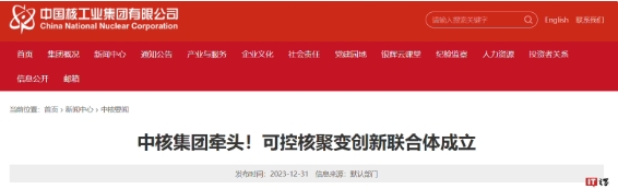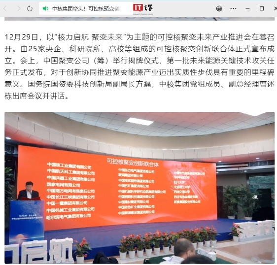 據中國核工業集團有限公司(簡稱中核集團)官網消息,12 月 29 日,以“核力啟航 聚變未來”為主題的可控核聚變未來產業推進會在蓉召開。由 25 家央企、科研院所、高校等組成的可控核聚變創新聯合體正式宣布成立。會上,中國聚變公司(籌)舉行揭牌儀式,第一批未來能源關鍵技術攻關任務正式發布,對于創新協同推進聚變能源產業邁出實質性步伐具有重要的里程碑意義。