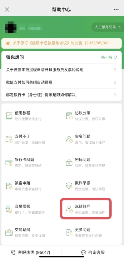 打客服電話95017轉9鍵,按提示操作就可以自助快速凍結微信支付賬戶。